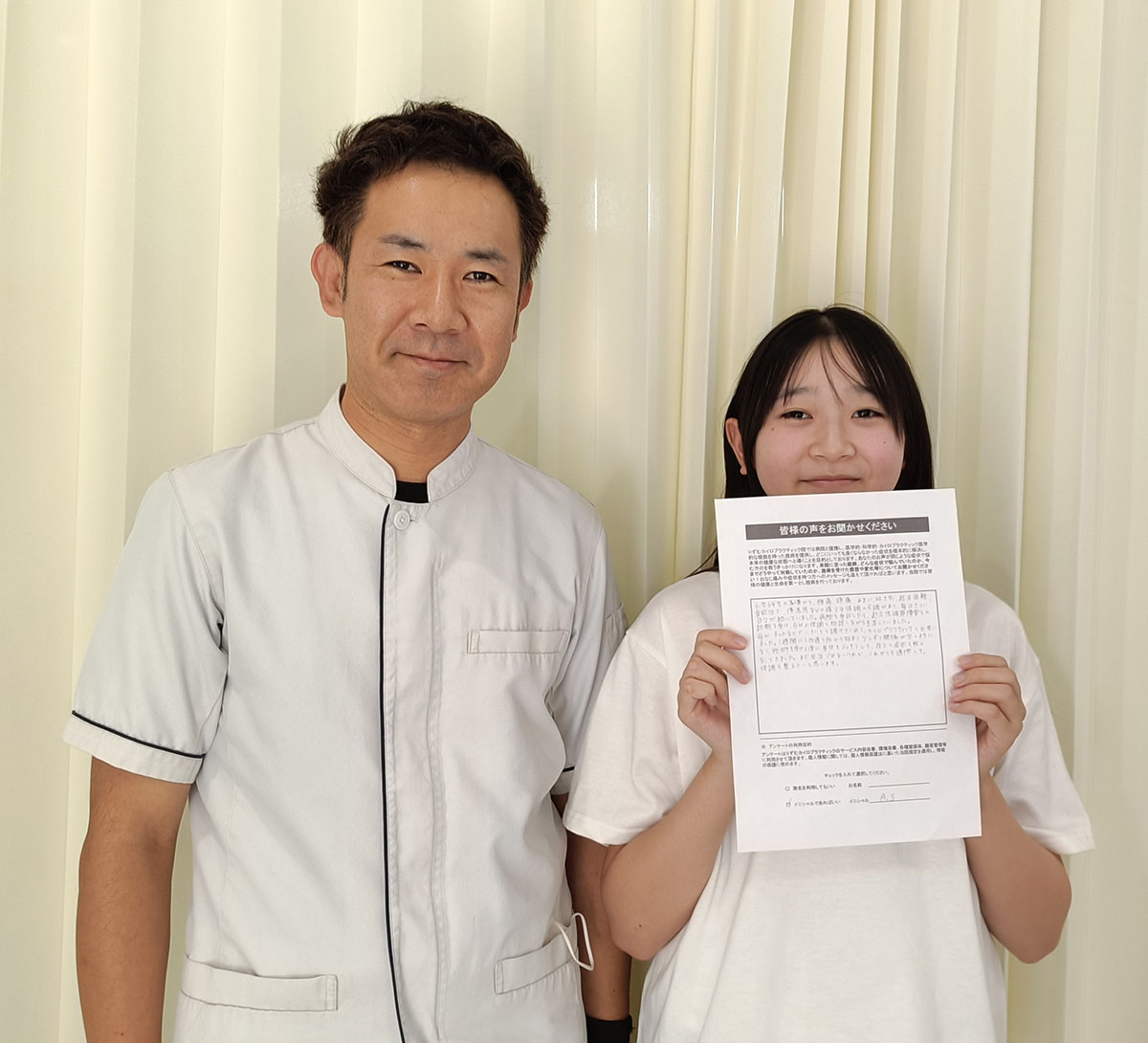 背骨が歪んでいて、まっすぐに座ったり、立つことができなかったけれど、施術を受けてだんだんまっすぐになってきているので、続けて通ってみたいと思いました。 (S.Y様 熊本市東区 10代男性) ※効果には個人差があります |