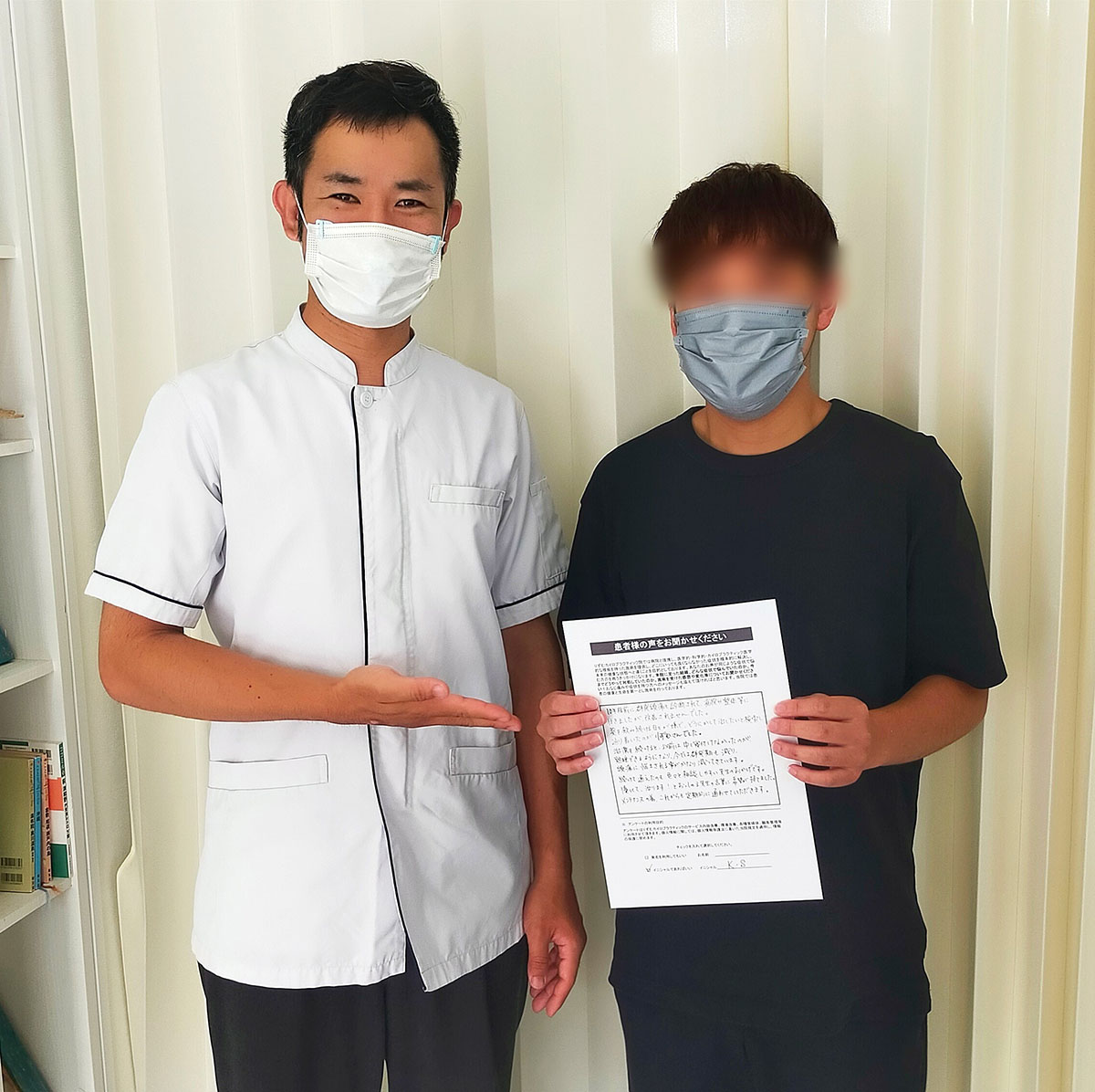 熊本市内にもいくつか整体院がありましたが、その中で医療機関と連携し、レントゲン等を参考にして施術を行うという安心感が決め手となり、先生の施術を受けました。